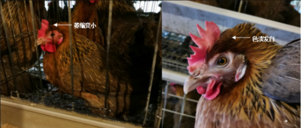 正常開產(chǎn)的成熟雞群雞冠、肉髯應(yīng)該豐滿挺立,紅潤(rùn)溫暖,感染IBV后出現(xiàn)異常的雞群會(huì)觀察到有部分雞的雞冠、肉髯萎縮變小、色淡發(fā)白,用手觸摸感覺冰涼。