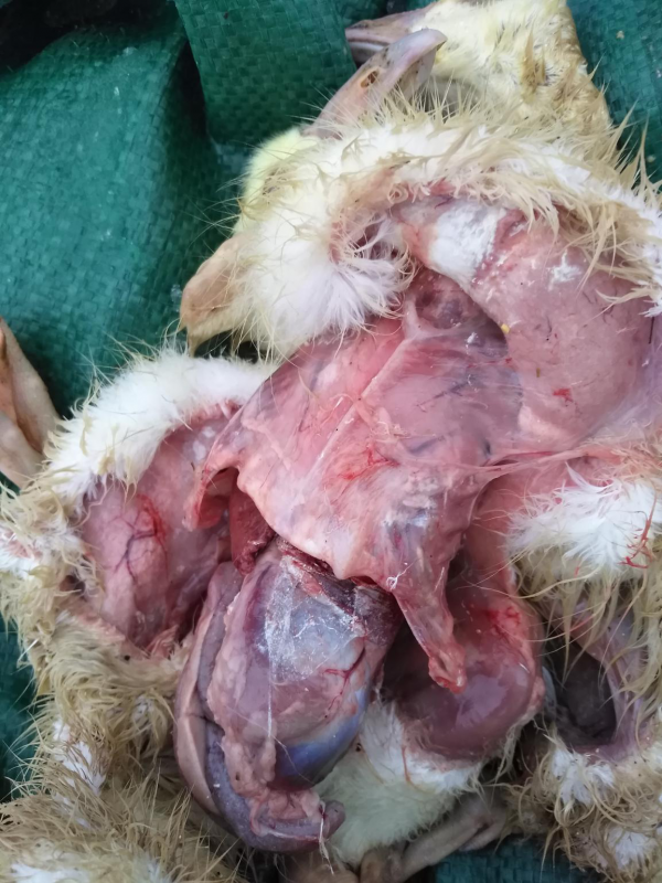 3、發(fā)病后期:表現(xiàn)站立不穩(wěn),喜臥,受驚嚇時(shí)也不能行走,雙側(cè)附關(guān)節(jié)明顯紅腫,喙發(fā)紅,體溫升高,脫水。附關(guān)節(jié)手感發(fā)燙,觸碰時(shí)雛鵝有疼痛感。大群拉水樣稀便。